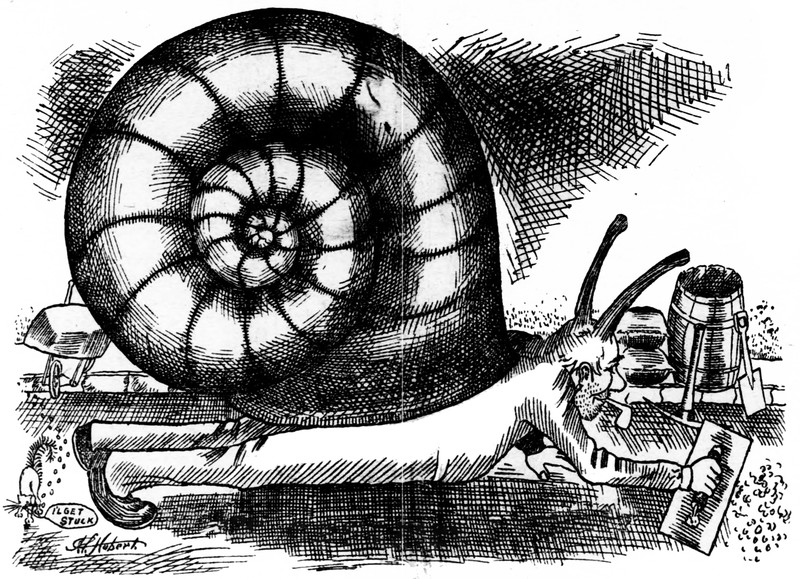 A human snail paving a road.  From the Duluth Evening Herald, 1903.