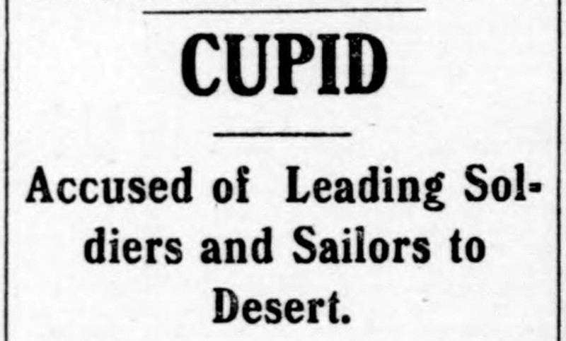 "Cupid accused of leading soldiers and sailors to desert."  From the Duluth Evening Herald, 1902.