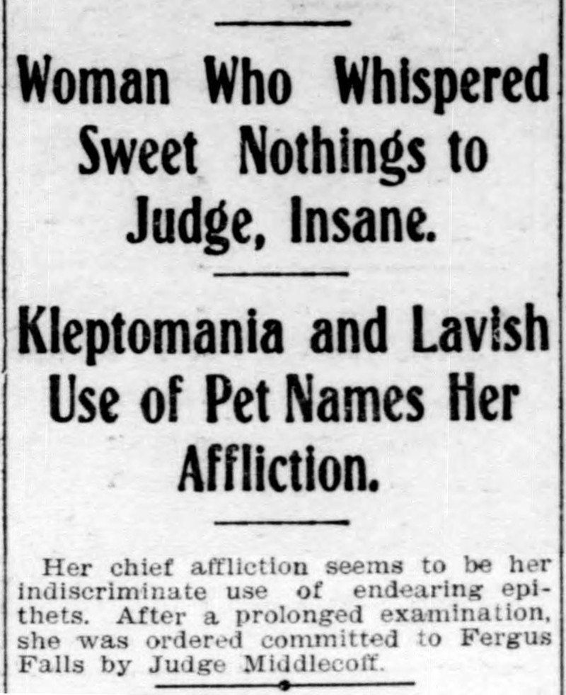 She was found to be insane for lavishly using pet names like "dearie" and "ducky."  From the Duluth Evening Herald, 1908.
