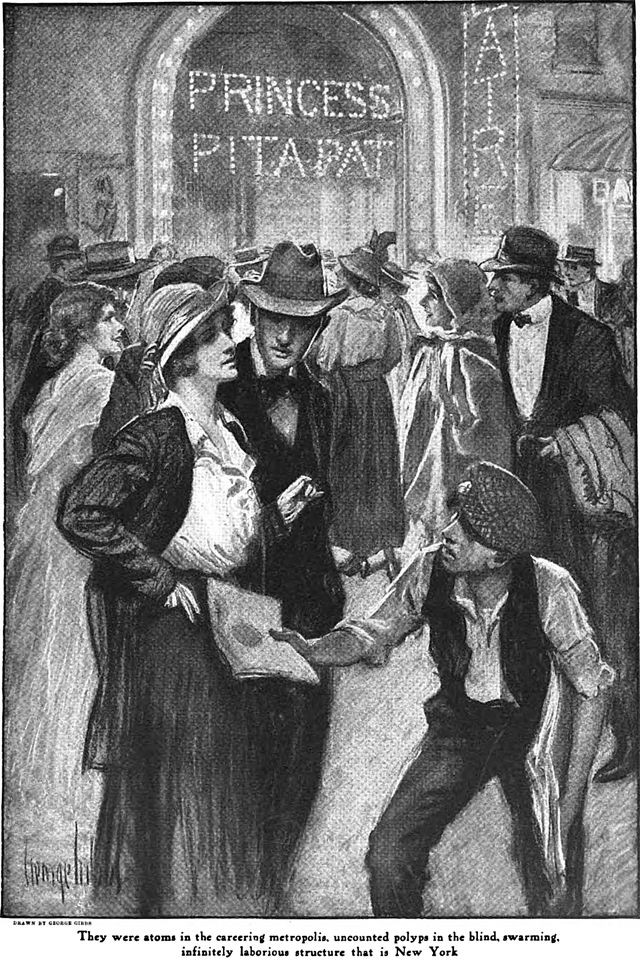 An illustration from a 1916 issue of Cosmopolitan magazine. The caption reads: "They were atoms in the careering metropolis, uncounted polyps in the blind, swarming, infinitely laborious structure that is New York."