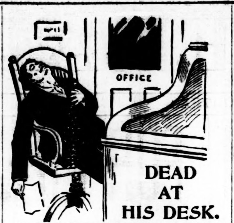 "Dead at his desk."  From the Duluth Evening Herald, 1897.