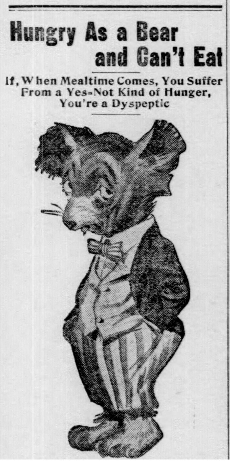 #vintage illustration #vintage ad #anthropomorphism #hunger #bear #dyspeptic #ad