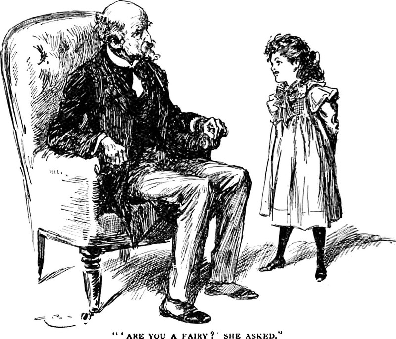 An illustration from a 1900 issue of The Strand magazine. The caption reads: "'Are you a fairy?' she asked."