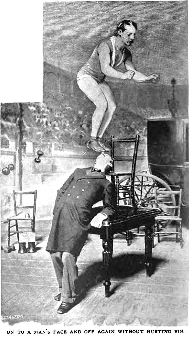 An illustration from an 1897 issue of The Strand magazine. The caption reads: "On to a man's face and off again without hurting him."