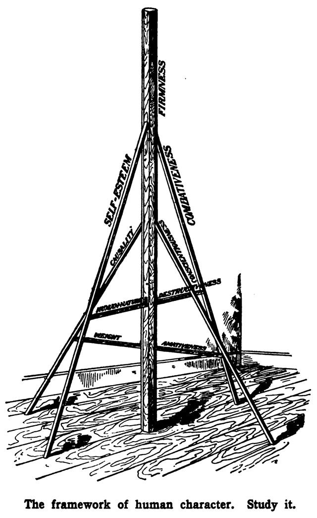 An illustration from a 1902 edition of Vaught's Practical Character Reader. The caption reads: "The framework of human character. Study it."