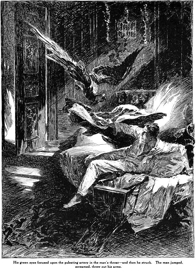 An illustration from a 1921 issue of Cosmopolitan magazine. The caption reads: "His green eyes focused upon the pulsating artery in the man's throat—and then he struck. The man jumped, screamed, threw out his arms."