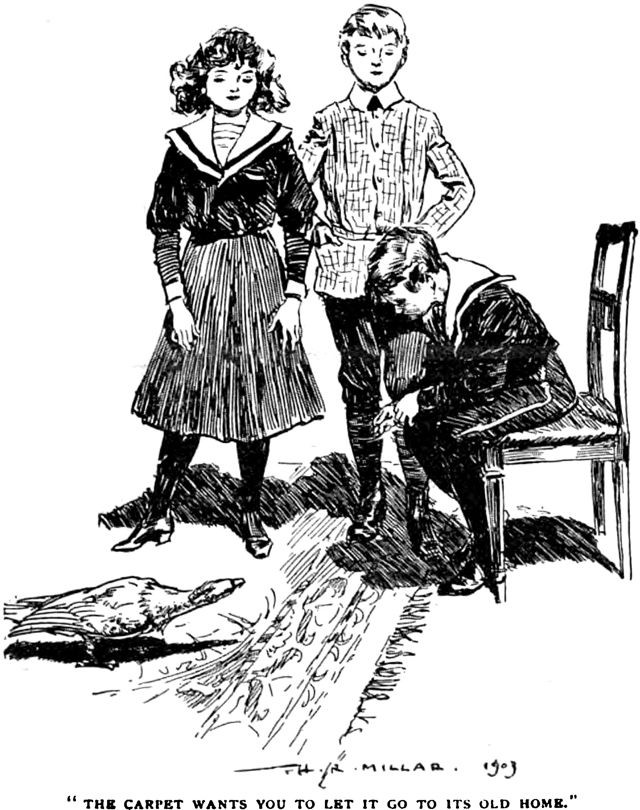 An illustration from a 1904 issue of The Strand magazine. The caption reads: "The carpet wants you to let it go to its old home."