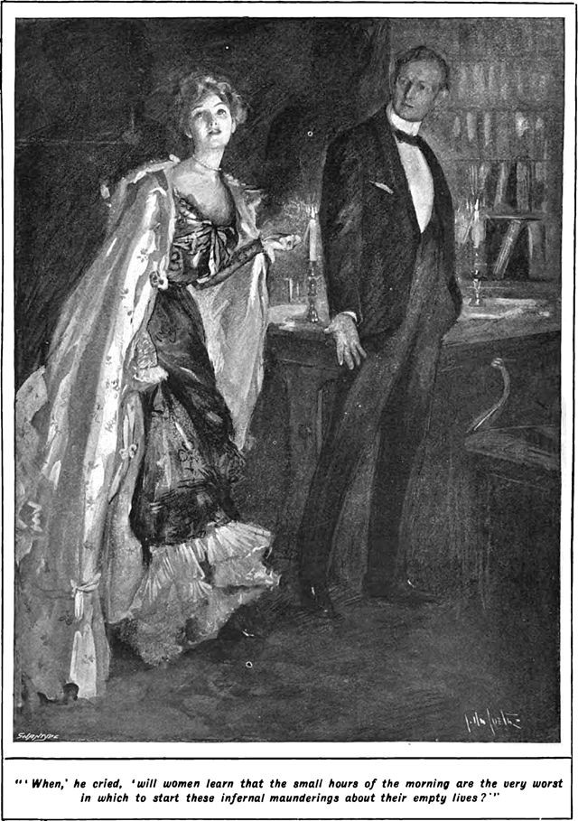 An illustration from a 1902 issue of Pall Mall magazine. The caption reads: "'When,' he cried, 'will women learn that the small hours of the morning are the very worst in which to start these infernal maunderings about their empty lives?'"