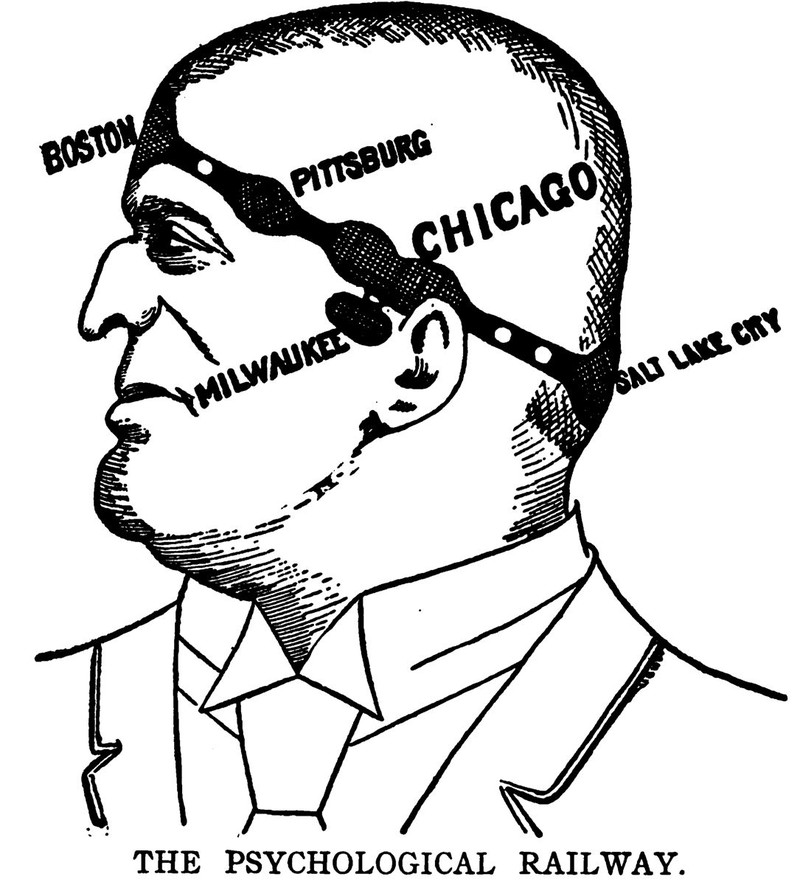 An illustration from a 1902 edition of Vaught's Practical Character Reader. The caption reads: "The Psychological Railway." (Thanks, Gordon!)