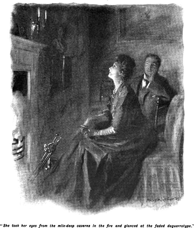 Staring into the depths: an illustration from a 1906 issue of Pall Mall magazine. The caption reads: "She took her eyes from the mile-deep caverns in the fire and glanced at the faded daguerrotype."