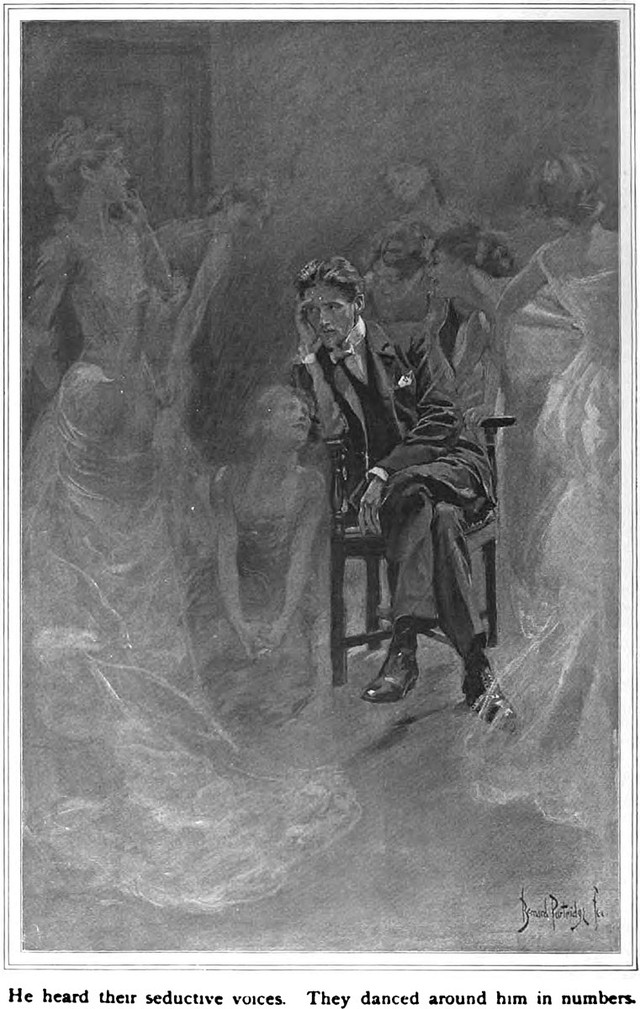 An illustration from a 1900 issue of Scribner's magazine. The caption reads: "He heard their seductive voices. They danced around him in numbers."