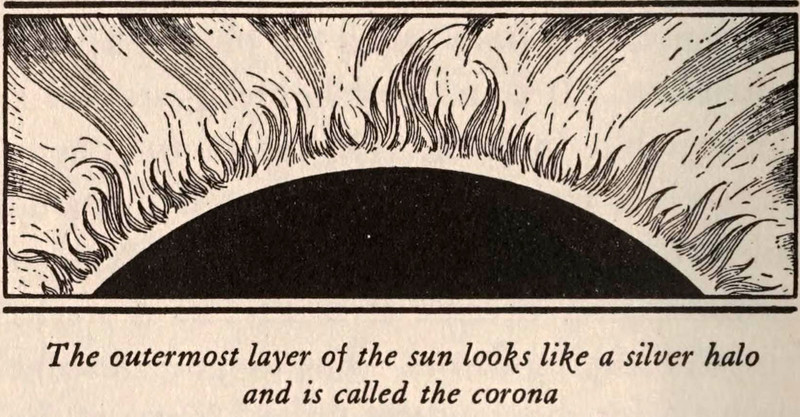 "The outermost layer of the sun looks like a silver halo and is called the corona." From Other Worlds Than This by Elena Fontany and illustrated by John Dukes McKee, 1930.