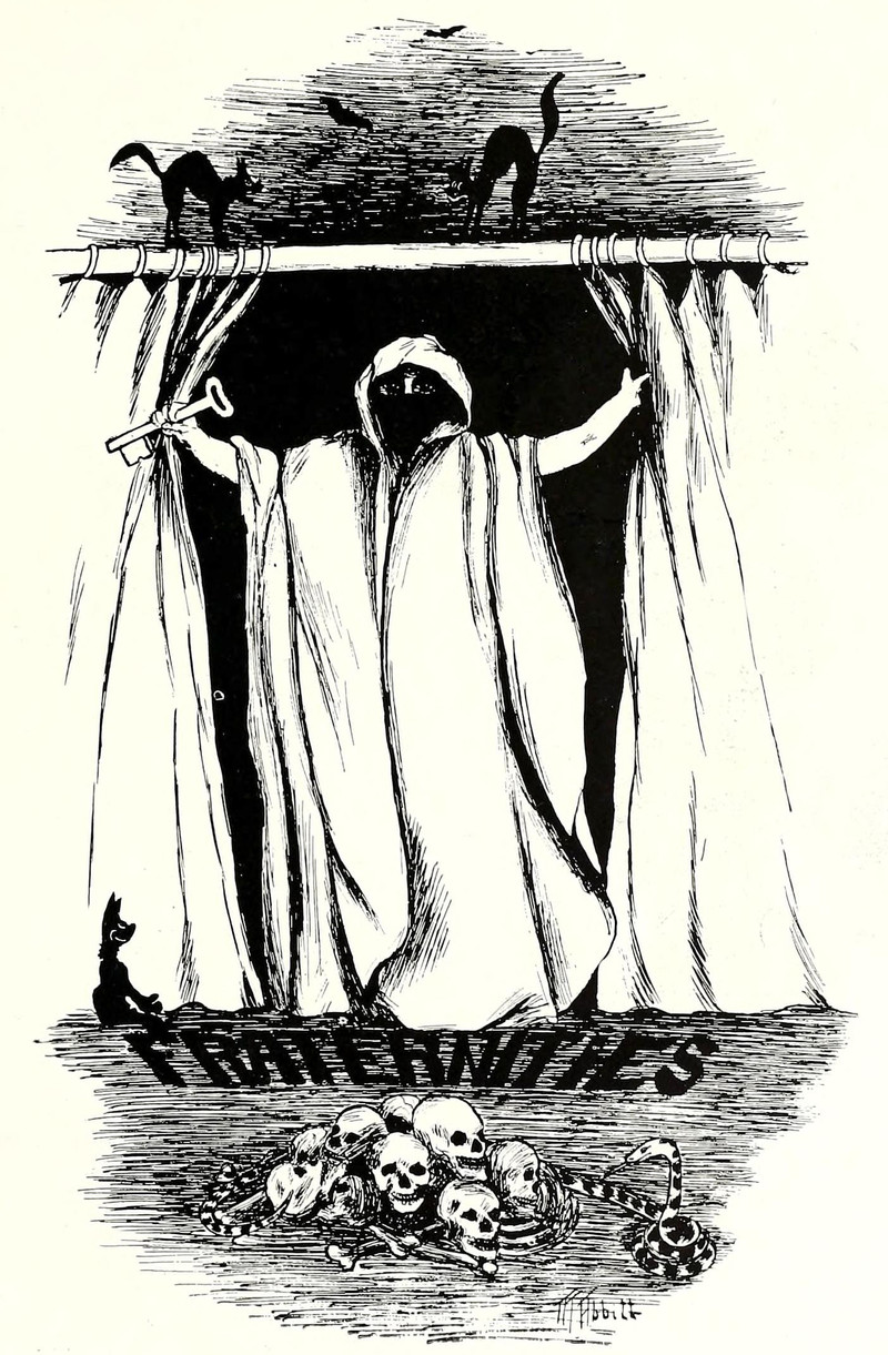 #vintage illustration #skull #fraternity #vintage yearbook #yearbook #secret society #hooded figure #curtains
