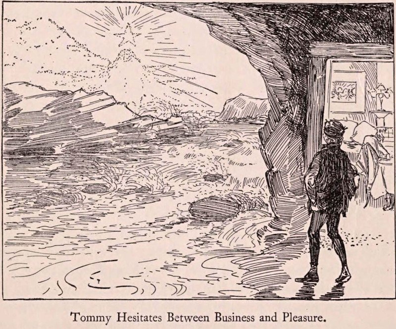 Hesitating between business and pleasure.  From Return of the Fairies by Charles J. Bellamy, 1899.