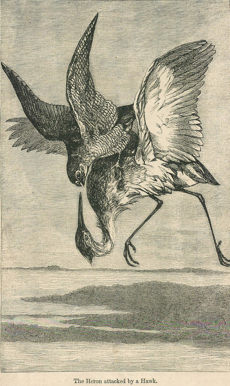 Hawk versus heron: which would you wager for the win?  From Chatterbox, 1879.