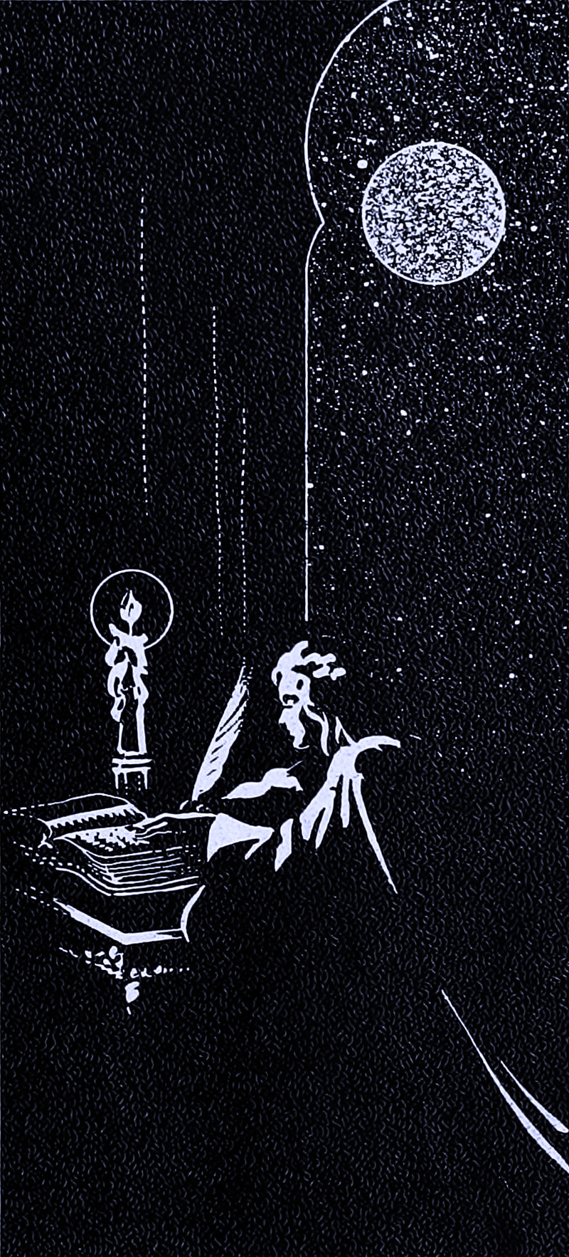 #vintage illustration #full moon #moon #vintage yearbook #yearbook #writing #quill pen #candle #moonlight #1930s #illustration #scholar