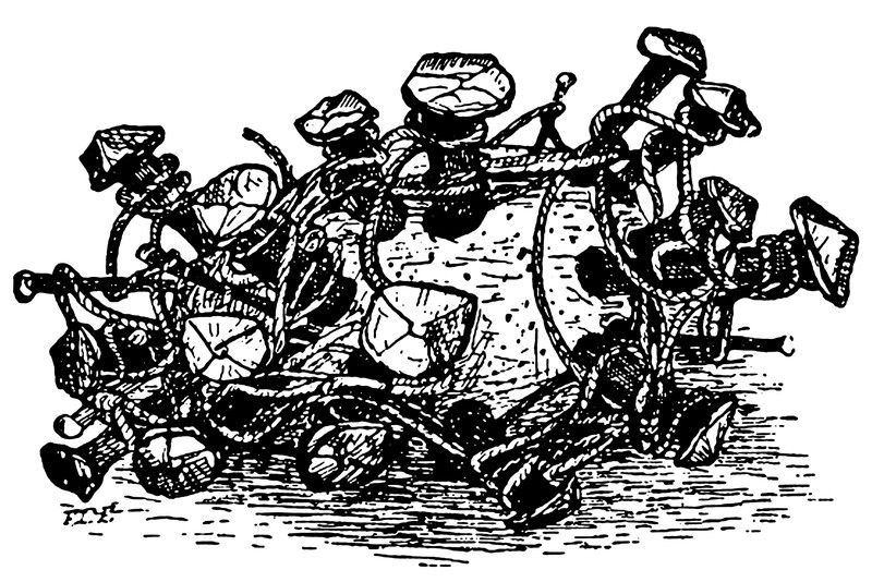 The fattura della morte (deathmaker), with 30 nails in a lime, onion, or heart, secured by twisted string, then danced around by naked witches. From The Evil Eye by Frederick Thomas Elworthy.