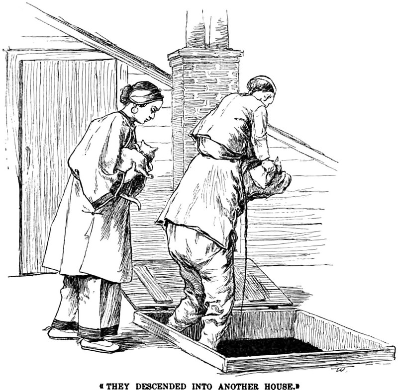 An illustration from an 1897 issue of Century Illustrated magazine. The caption reads: "They descended into another house."