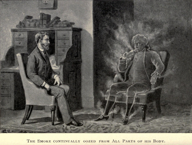 "Smoke continually oozed from all parts of his body."  From Montezuma's Castle and Other Weird Tales by Charles B. Cory, 1899.