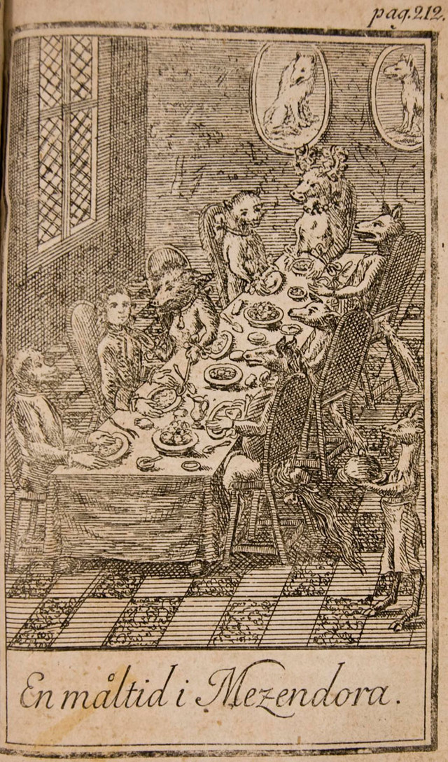 Above: An illustration from an 1894 issue of Frank Leslie's Popular Monthly magazine whose caption indicates that the faces of the subject's companions were transformed. Below: An illustration from Niels Klim's Journey Under the Ground (1767) by Baron Ludvig Holberg.