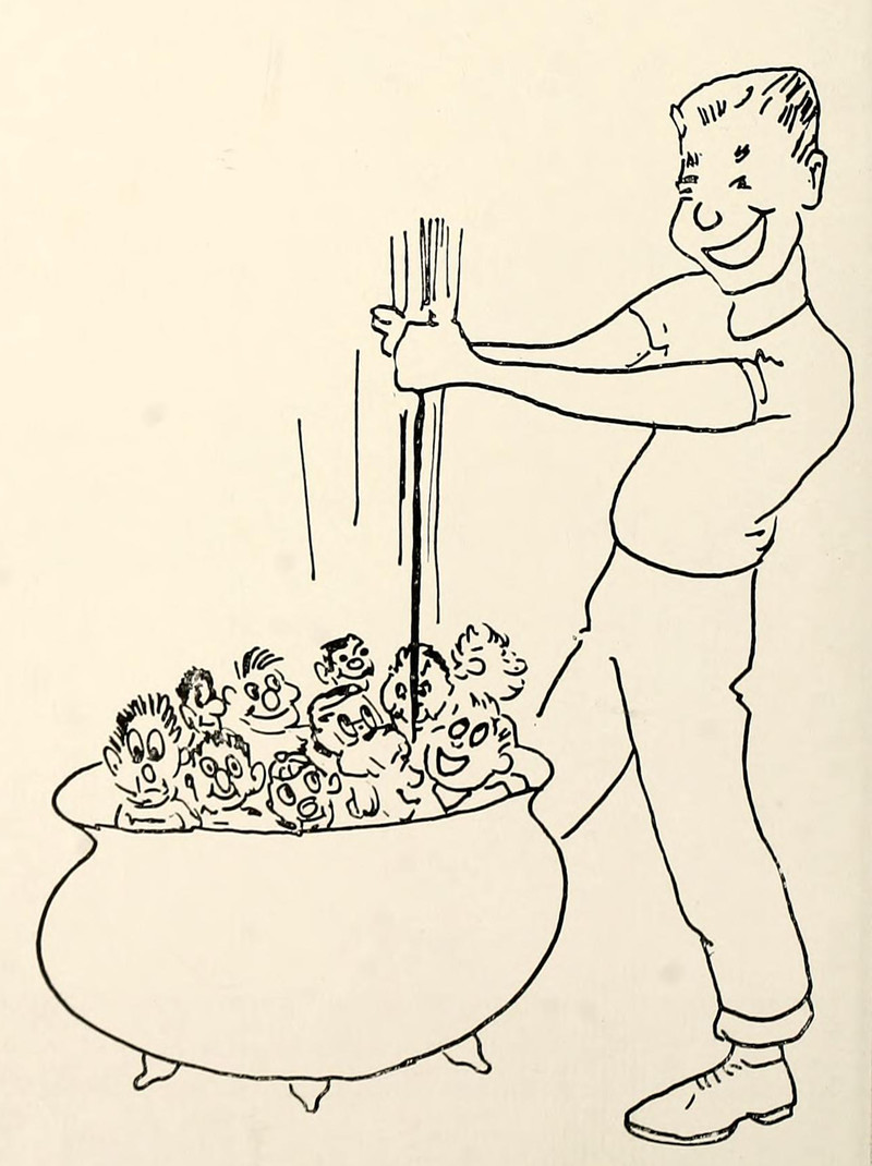 #vintage illustration #cauldron #vintage yearbook #tiny men