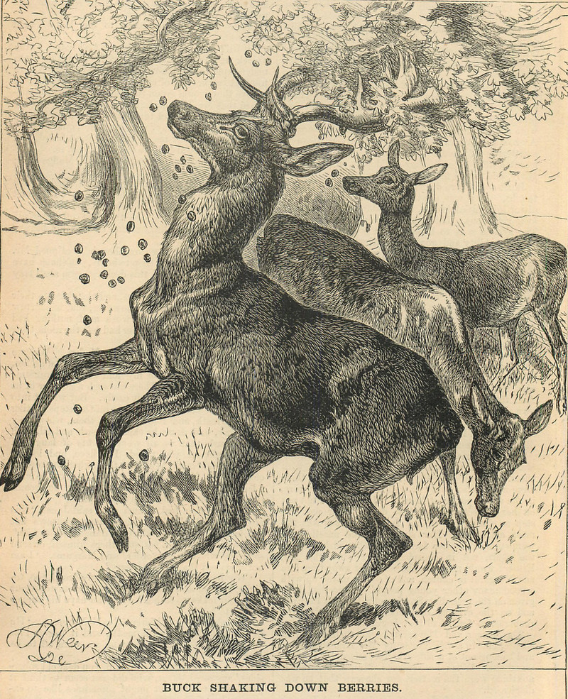 "Buck shaking down berries."  From Chatterbox, 1886.