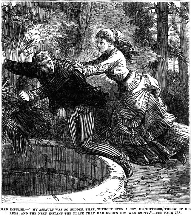 "Mad Impulse": an illustration from an 1876 issue of Frank Leslie's Pleasant Hours magazine. The caption reads: "My assault was so sudden, that, without even a cry, he tottered, threw up his arms, and the next instant the place that had known him was empty."
