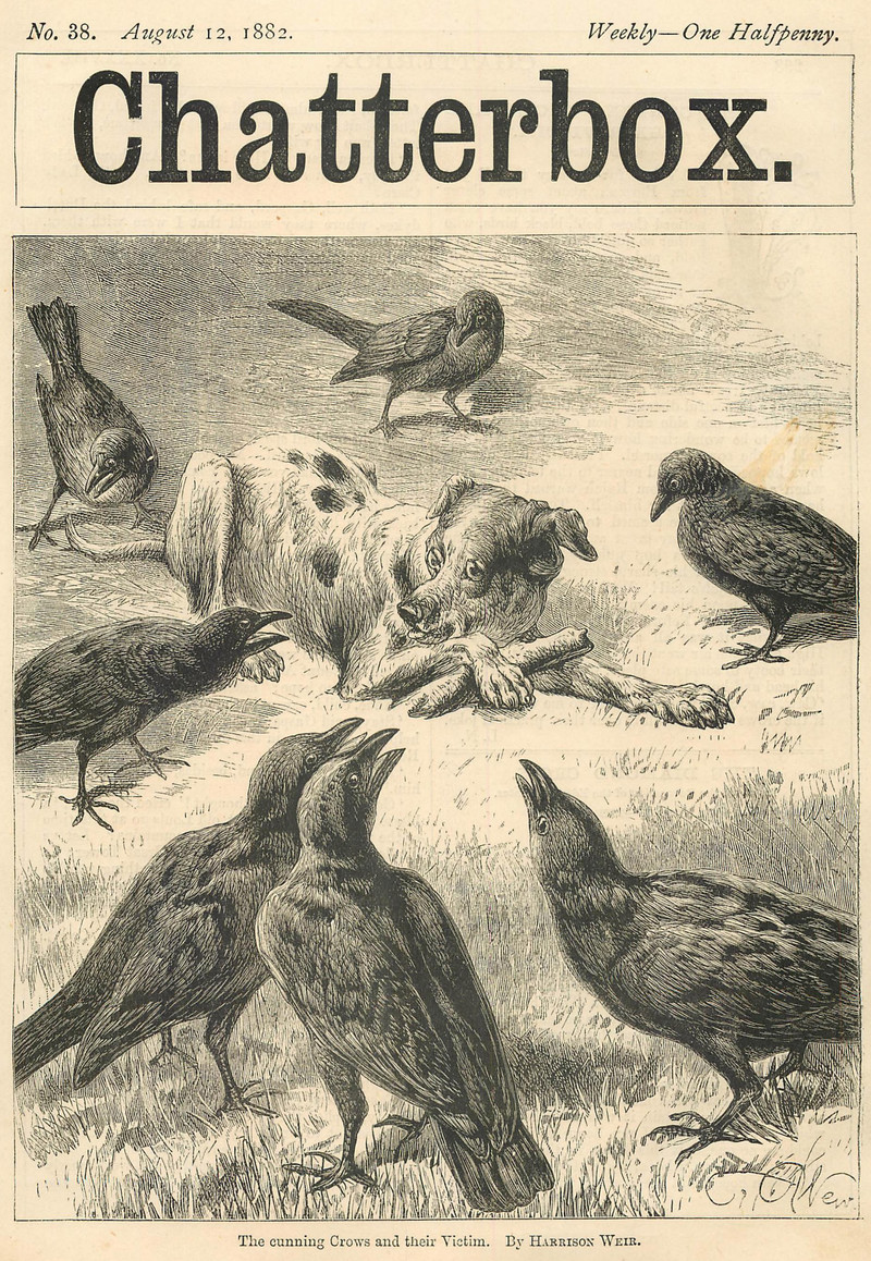 Crows versus dog.  Which do you wager for the win?  From Chatterbox, 1882.