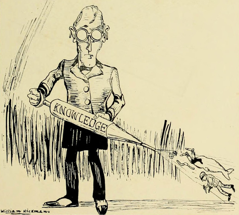 A teacher spraying the bug powder of knowledge at someone being swallowed by a whale as well as a masked gun- and knife-wielder. From West Virginia Wesleyan College's 1921 yearbook.
