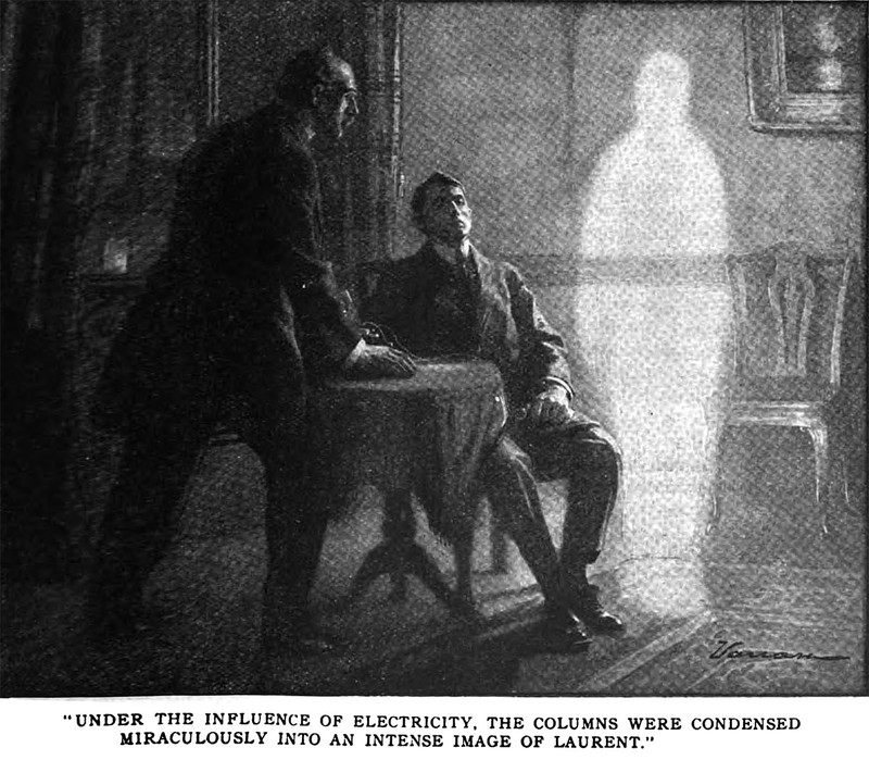 An illustration from a 1910 issue of Hampton's magazine. The caption reads: "Under the influence of electricity, the columns were condensed miraculously into an intense image of Laurent."