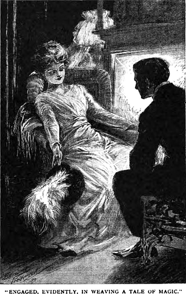An illustration from a 1909 issue of Hampton's magazine. The caption reads: "Engaged, evidently, in weaving a tale of magic."