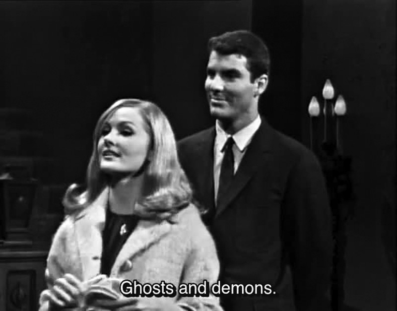 "Ghosts and demons."  From Dark Shadows episode 14.  There was also that time that Liz Stoddard said the single word "Goblins," here.