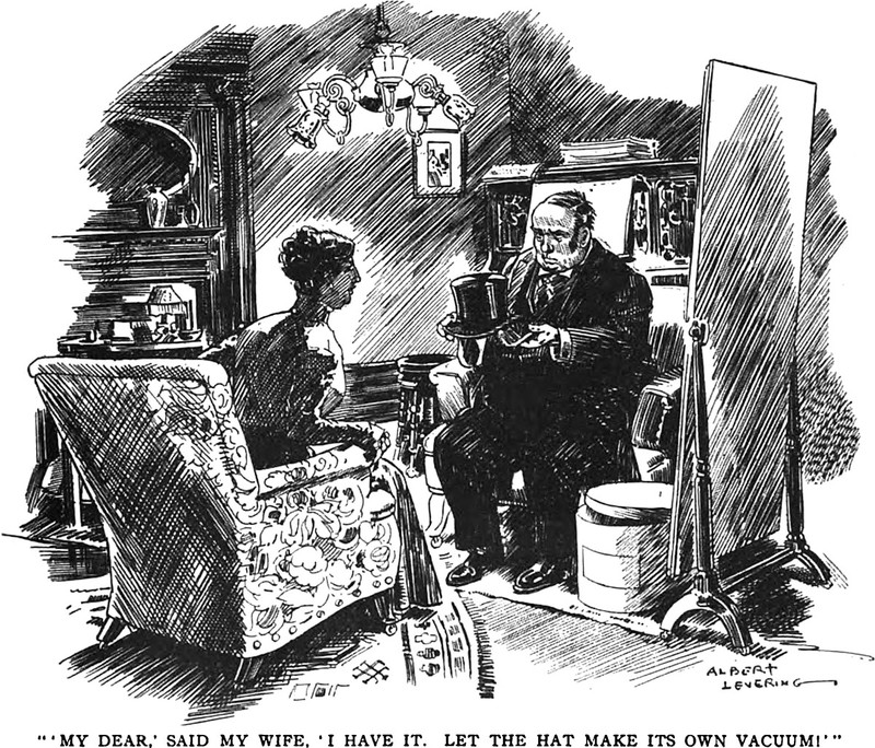 An illustration from a 1910 issue of Hampton's magazine.  The caption reads: "'My dear,' said my wife, 'I have it.  Let the hat make its own vacuum!'"