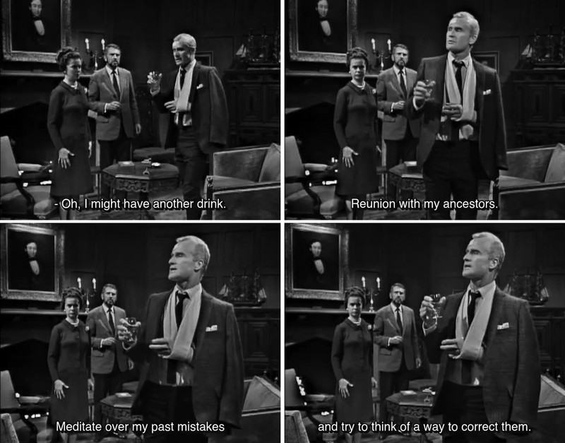 "Oh, I might have another drink. Reunion with my ancestors. Meditate over my past mistakes and try to think of a way to correct them." From Dark Shadows episode 17.