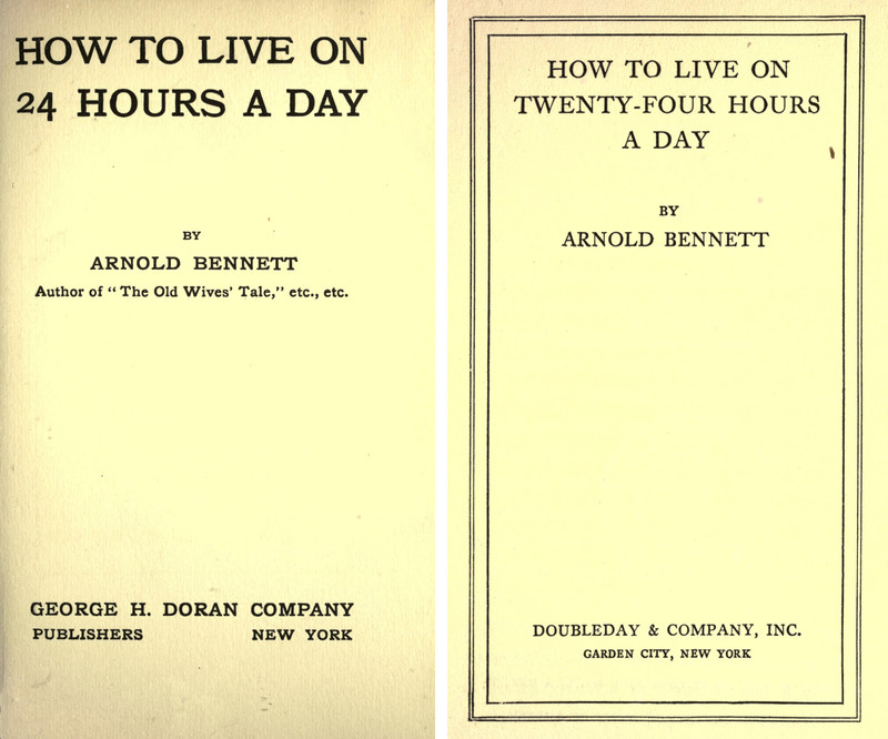 Great title: How to Live on 24 Hours a Day by Arnold Bennett, 1910. But does spelling out the number 24 make for a longer day? The version with the numeral has 75 pages, and the version with "twenty-four" has 103 pages.