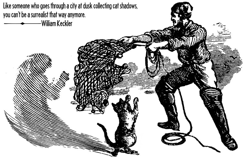 Inspired by and for William Keckler.  The quotation reads, "Like someone who goes through a city at dusk collecting cat shadows, you can't be a surrealist that way anymore."
