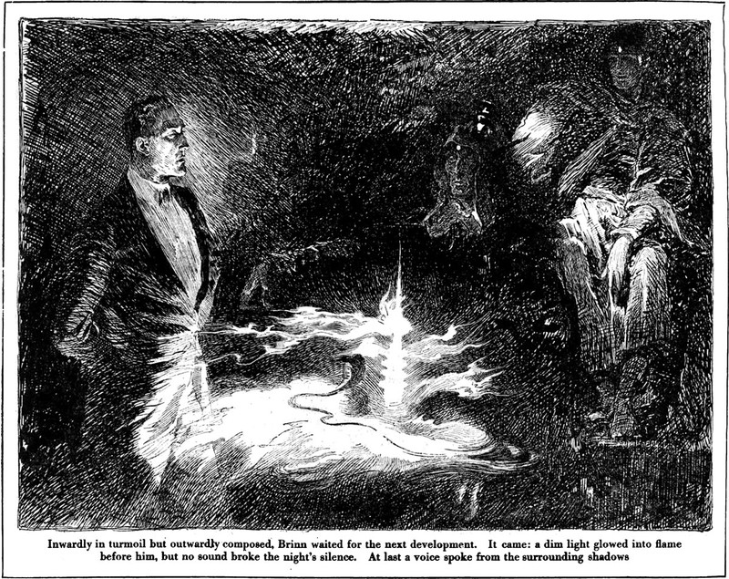 An illustration from a 1921 issue of Collier's magazine. The caption reads: "Inwardly in turmoil but outwardly composed, Brinn waited for the next development. It came: a dim light glowed into flame before him, but no sound broke the night's silence. At last a voice spoke from the surrounding shadows."