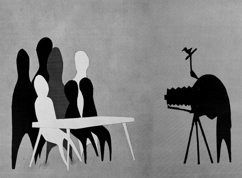 Ghosts (both light bodies and shadow selves) watch the birdie for a spirit photograph.  From the University of Bridgeport's 1959 yearbook.