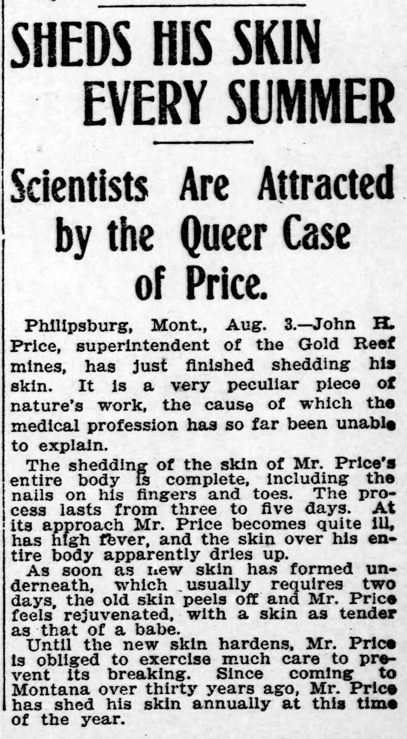 "Sheds his skin every summer."  From the Duluth Herald, 1906.
