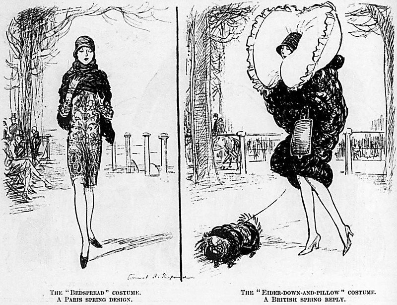 The French "bedspread" costume, and the British "eider-down-and-pillow" costume.  From Punch, 1928.