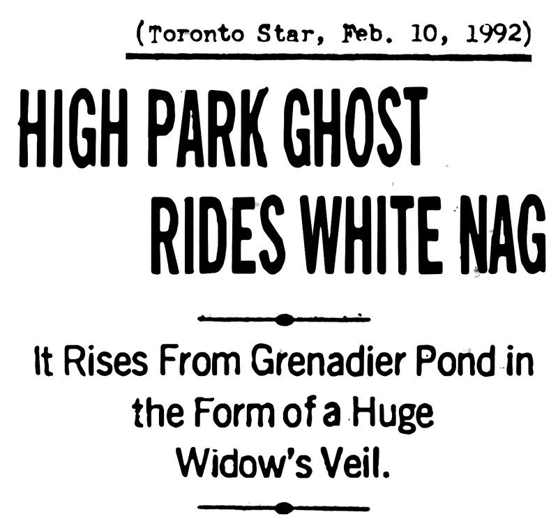 "High Park ghost rides white nag.  It rises from Grenadier Pond in the form of a huge widow's veil."  From the Toronto Star, 1992.