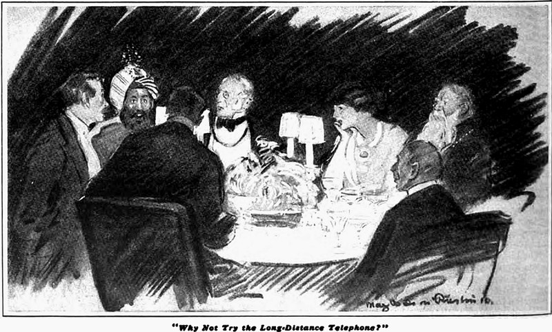 Out of context, it appears that everyone is expecting the man with a beard and turban to initiate contact with the Beyond. The caption reads: "Why not try the long-distance telephone?" This fakir's no faker! From The Saturday Evening Post, 1911.