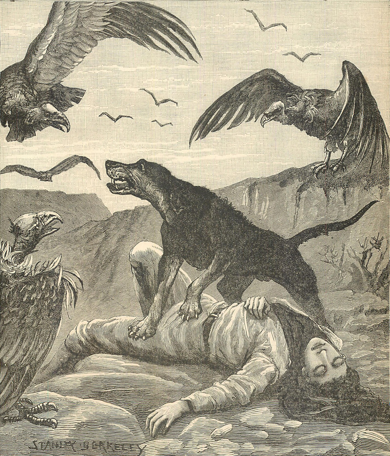 Vulture versus dog.  Which do you wager for the win?  From Chatterbox, 1896.