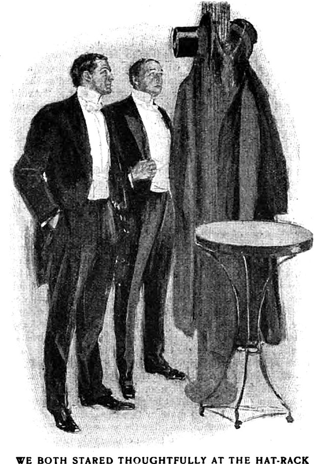 An illustration from a 1904 issue of Saturday Evening Post magazine.  The caption reads: "We both stared thoughtfully at the hat-rack."