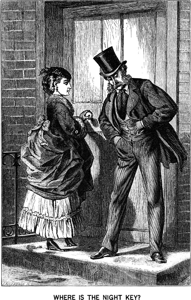 An illustration from an 1871 issue of Godey's magazine. The caption reads: "Where is the night key?"