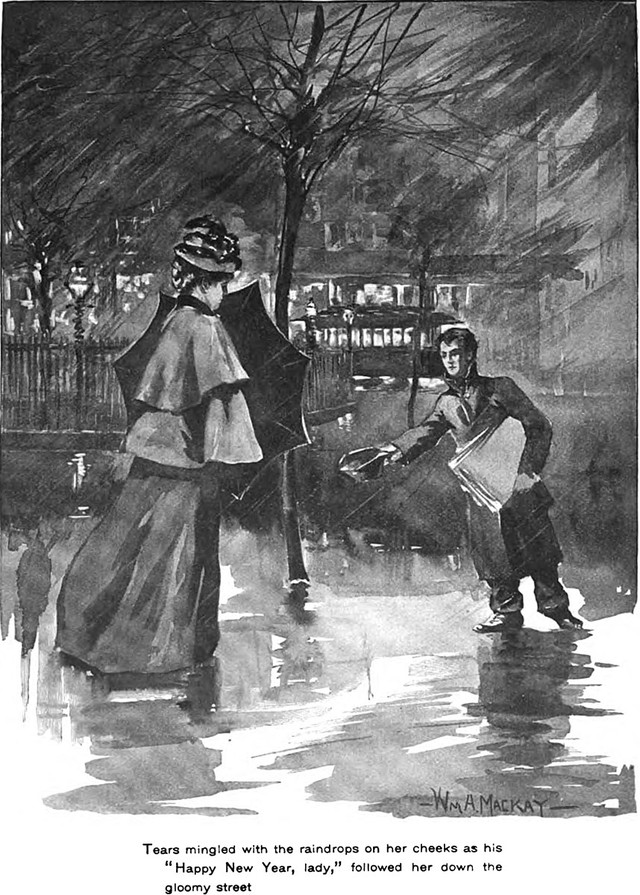 An illustration from an 1899 issue of Good Housekeeping magazine. The caption reads: "Tears mingled with the raindrops on her cheeks as his 'Happy New Year, lady,' followed her down the gloomy street."