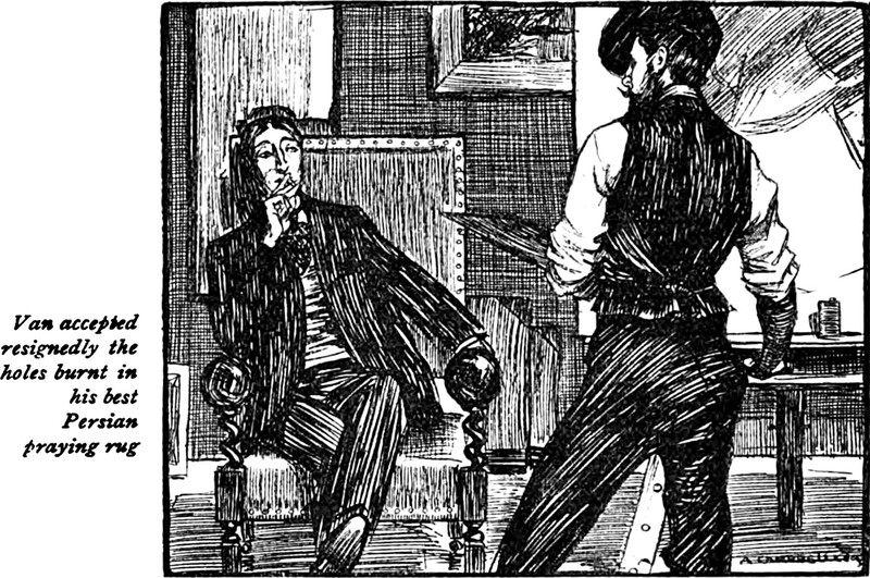 An illustration from an 1899 issue of Quartier Latin magazine. The caption reads: "Van accepted resignedly the holes burnt in his best Persian praying rug."