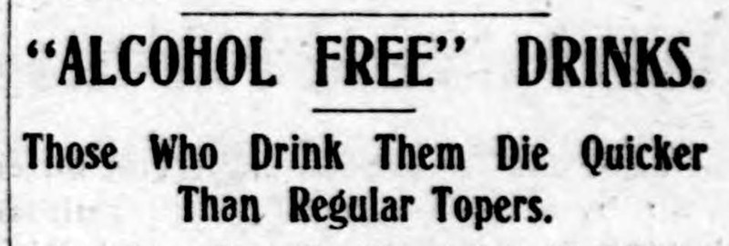 "'Alcohol free' drinks.  Those who drink them die quicker than regular topers."  From the Duluth Herald, 1906.