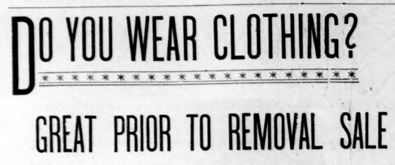 "Do you wear clothing?  Great prior to removal sale."  From the Duluth Herald, 1891.