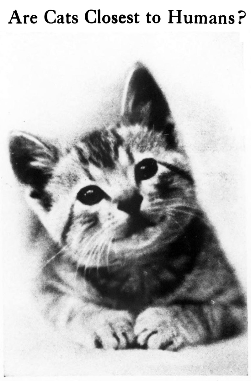 "Are cats closest to humans?"  From the Massachusetts Society for the Prevention of Cruelty to Animals' Our Dumb Animals magazine, 1932.